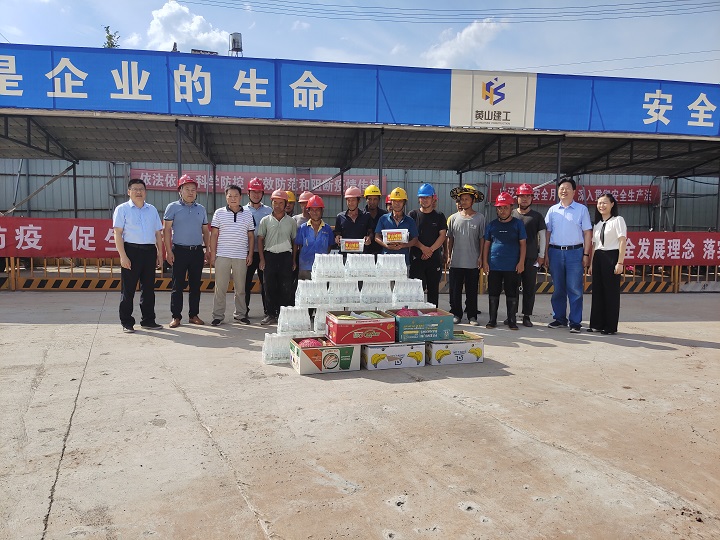 7月21上午,業主單位黃山市城投集團黨委書記、董事長陳杰、總裁黃世穩等一行分組帶隊到我公司承建的黃山市危險(含醫療)廢物集中處置中心易地重建工程、黃山市南部城鎮群水務調度中心項目、黃山生豬定點屠宰加工及配套設施項目及配套冷鏈項目施工現場送來了人丹、十滴水、礦泉水、西瓜等防暑降溫用品,并向奮戰在一線的施工人員及項目部管理人員表示了親切的慰問和感謝,對一線人員頭頂烈日不畏酷暑的精神給予了贊揚。