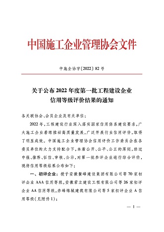 2022年,黃山市建工集團股份有限公司再次榮獲施工企業最高信用評級“AAA級企業信用證書”。這是對黃山市建工集團股份有限公司持續積累的經營管理能力、合同履約能力、市場競爭能力及優質社會形象的權威認證。
