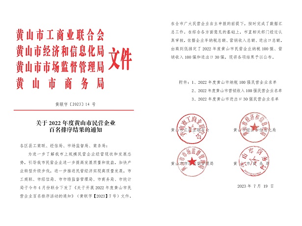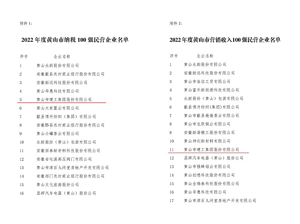 日前,由黃山市工商聯(lián)、市經(jīng)信局、市監(jiān)管局及市商務(wù)局聯(lián)合發(fā)布2022年度黃山市民營企業(yè)納稅及營銷收入百強(qiáng)名單公布,黃山建工集團(tuán)連續(xù)多年再次實(shí)力入圍,獲此殊榮!