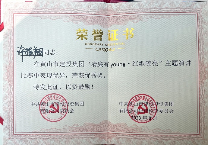 為慶祝中國共產(chǎn)黨成立102周年,深入推動學(xué)習(xí)貫徹習(xí)近平新時(shí)代中國特色社會主義思想主題教育,全面貫徹落實(shí)黨的二十大精神,8月18日,由黃山建投集團(tuán)舉辦的“清廉有young·紅歌嘹亮”主題思政課隆重舉行,參賽選手以生動的語言、動聽的歌聲、真摯的感情為大家?guī)硪粓鰟e開生面的視聽盛宴,黃山建工集團(tuán)青年員工許振翔在思政課演講比賽中取得優(yōu)勝獎。