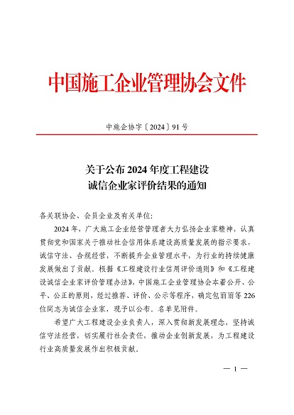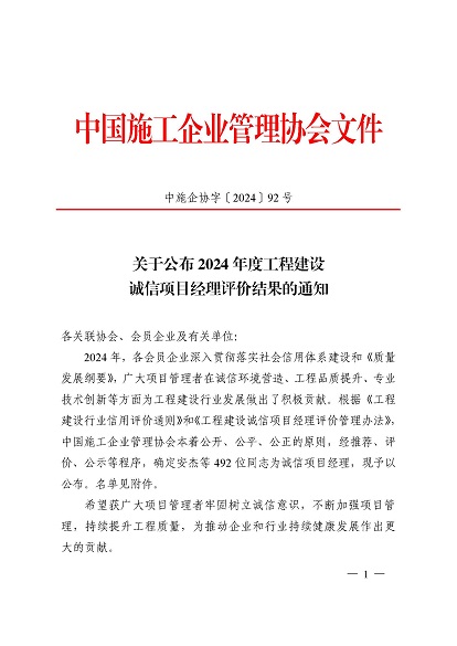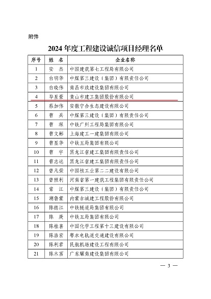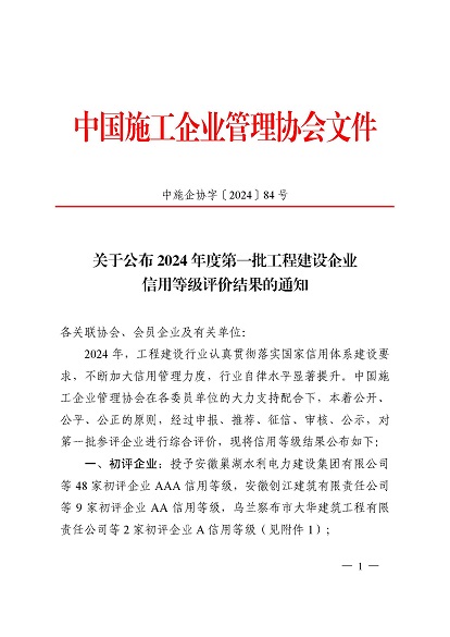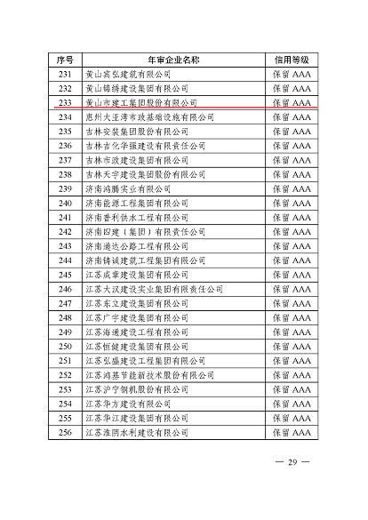 近日,中國施工企業管理協會公布了2024年度第一批工程建設企業信用等級評價結果的通知、工程建設誠信企業家評價結果、工程建設誠信項目經理名單。黃山建工集團順利通過AAA級信用企業的年審,繼續保持AAA信用等級的殊榮。黃山建工集團總經理葉金發獲評誠信企業家,項目經理畢星豪獲評誠信項目經理。此次榮譽是對黃山建工集團在工程建設領域的綜合實力和誠信經營的高度認可。